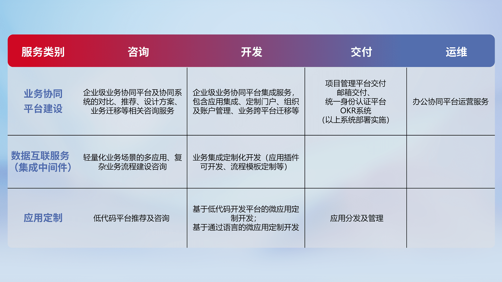 针对钉钉、、企微、、、、IDaas等平台级产品提供产品的规划、、、方案、、、交付、、、定制化开发等服务,,实现如统一协同办公、、智能客户服务、、、、混合会议管理、、、智能数据查询、、、等业务场景,,,,实现数字化转型。。。